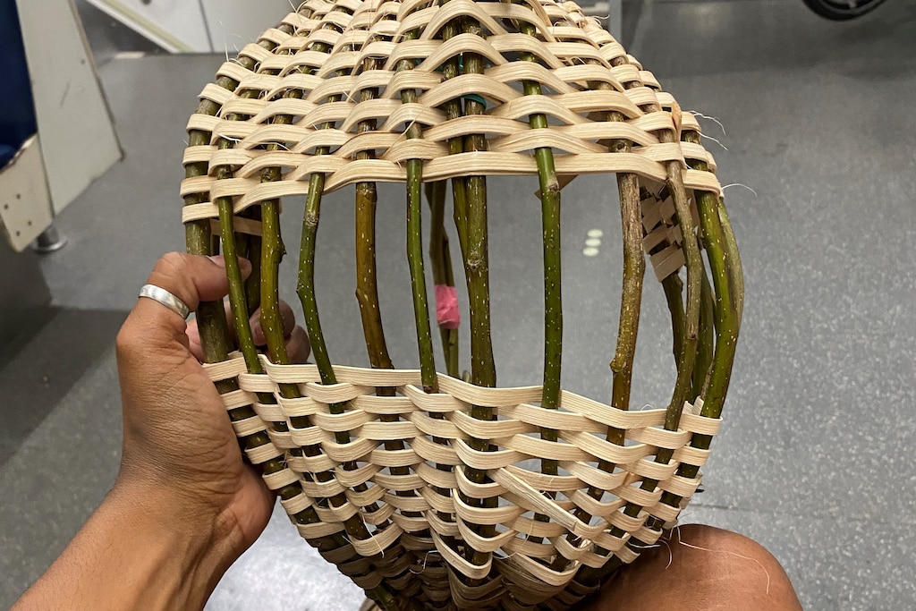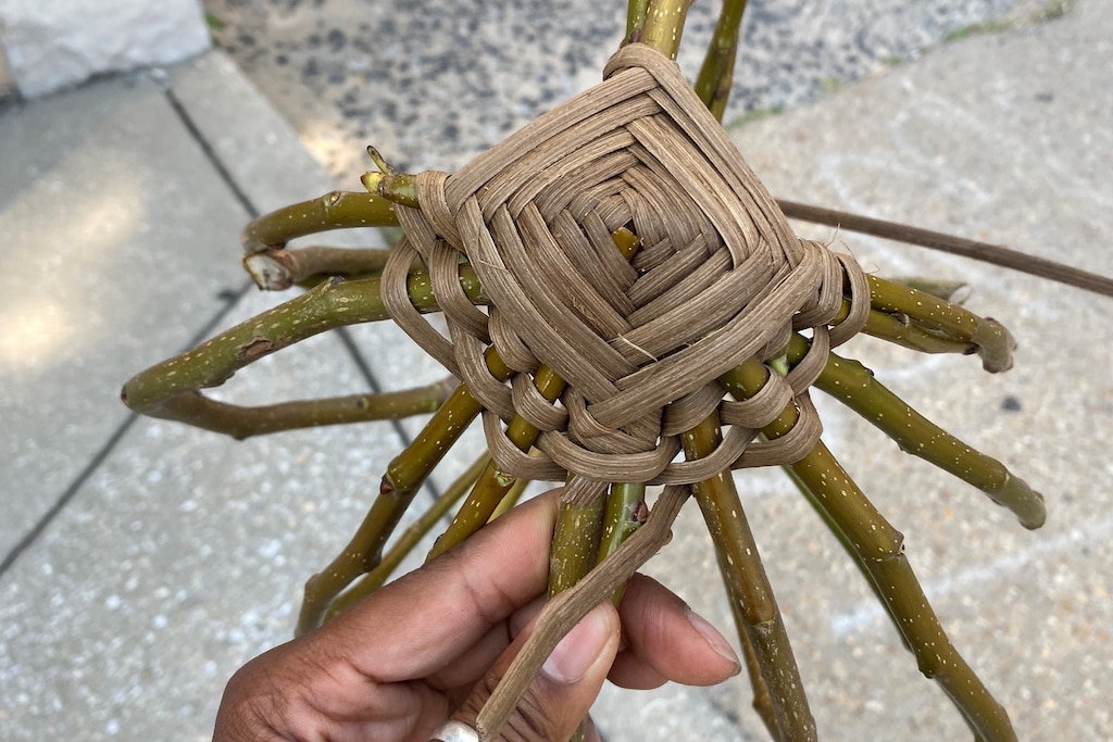 Williams McCallister bends the sucker, tilting it into the shape of a basket and tying it before it dries. Fellow artist Najee Haynes-Follins follows with another sucker as Williams McCallister teaches them the weaving technique.