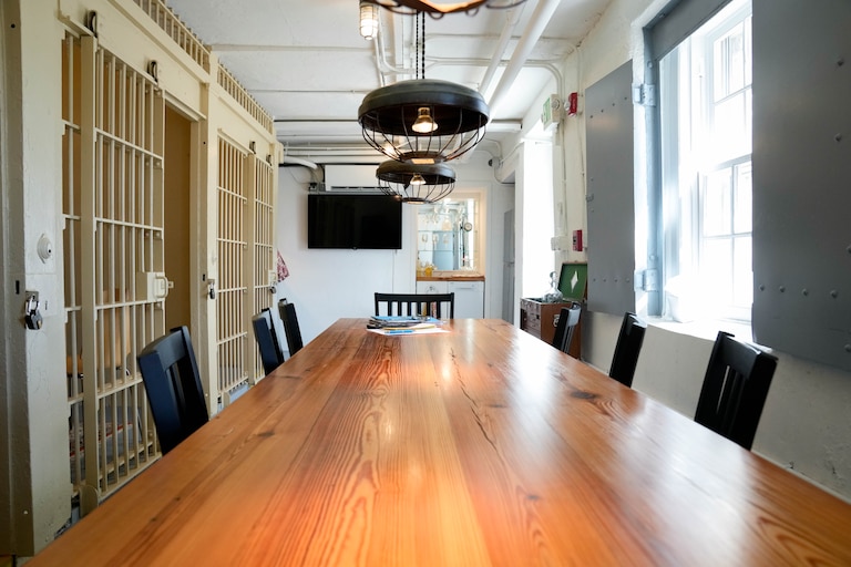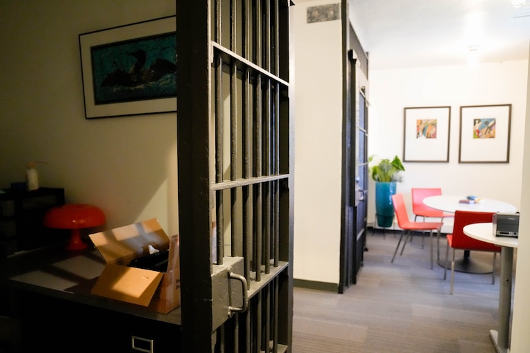 “It just doesn’t grab you as a jail. I mean, does this look like a jail? Well, except for the bars over there,” said Azola, gesturing to the steel accents around a kitchenette. “Instead of scary, I would say it’s become interesting.”