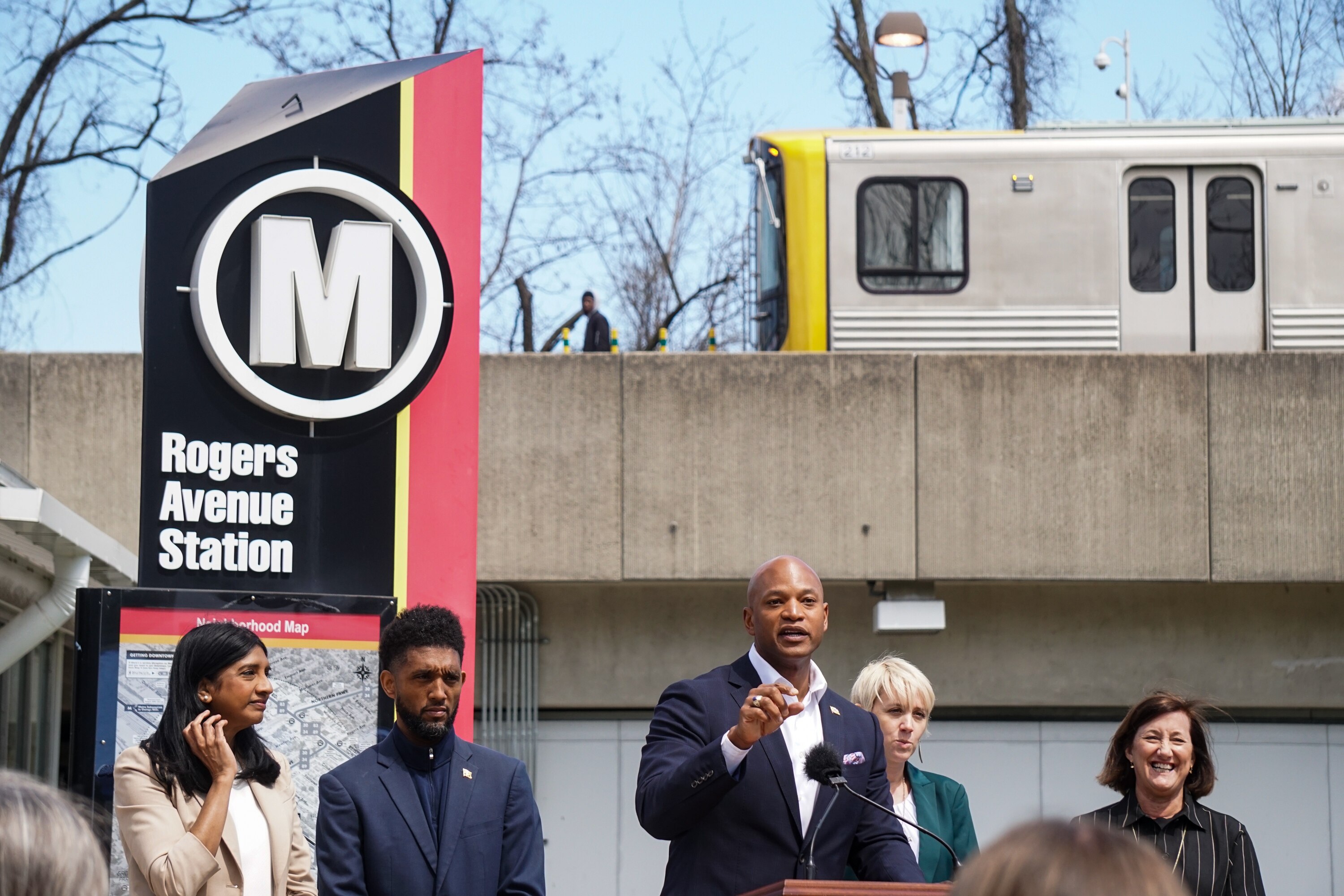 “Welcome to my subway station,” said Baltimore Mayor Brandon Scott, earning laughs from the crowd.