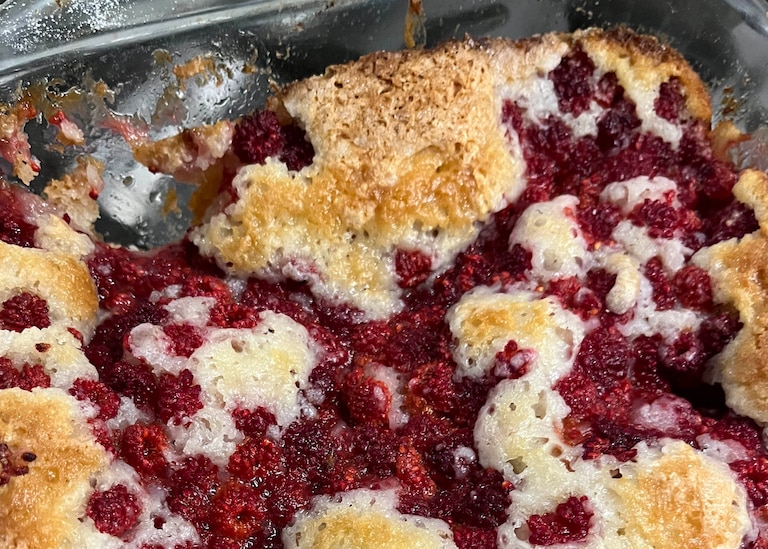 Reporter Liz Bowie shares this recipe that her husband adapted from Allrecipes. The original cobbler recipe called for black raspberries, but we think the wineberries give it a unique flavor that can’t be beat.