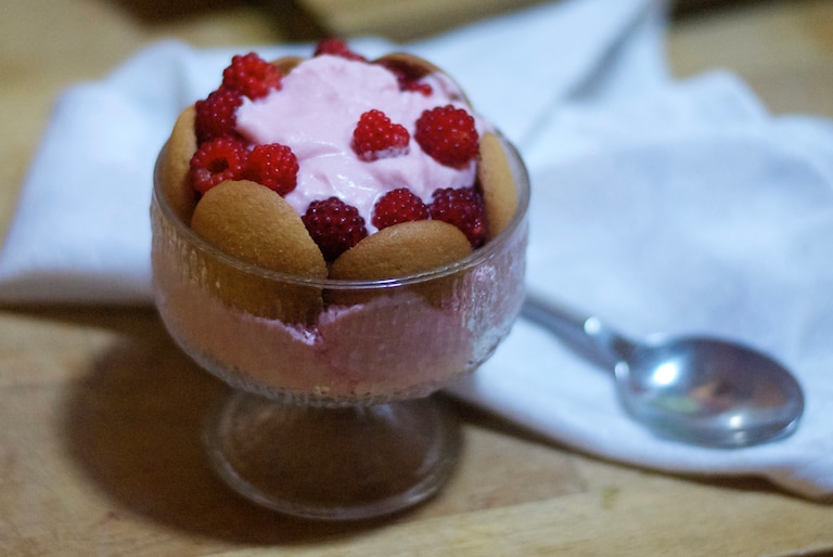 Clean and dry berries, add sugar and let stand to extract juice. Mash berries slightly, put in a pot and bring slowly to a boil. Cook until soft, strain through a sieve and chill. When the juice is cold, whip the cream and add the fruit to it. Refrigerate or freeze for at least 2 hours before serving.