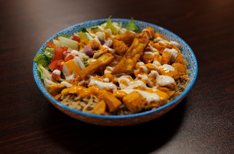 He was preparing a bowl on a recent visit and drizzled a house-made, glowing orange “spicy” sauce that was effectively a chipotle ranch, Abbasi said. Next came a squeeze bottle of a white sauce, and I wondered whether it was yogurt-based like at other rice-and-meat shops.