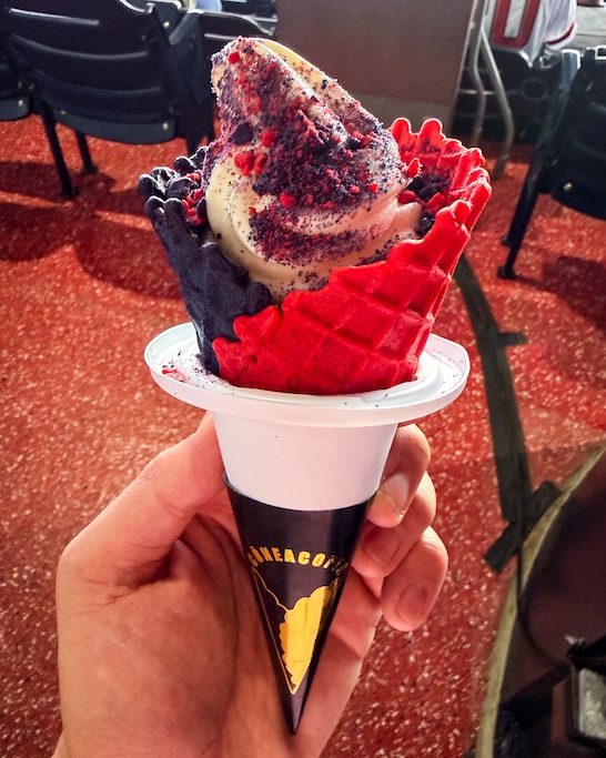 I’m partial to a swirl of soft serve in a mini novelty helmet when I attend a game but had a good enough time nibbling on the dyed-red-and-blue waffle cone filled with soft serve and topped with “cone dust.” It has crumbled bits of the very same cone to give a food-colored crunch.