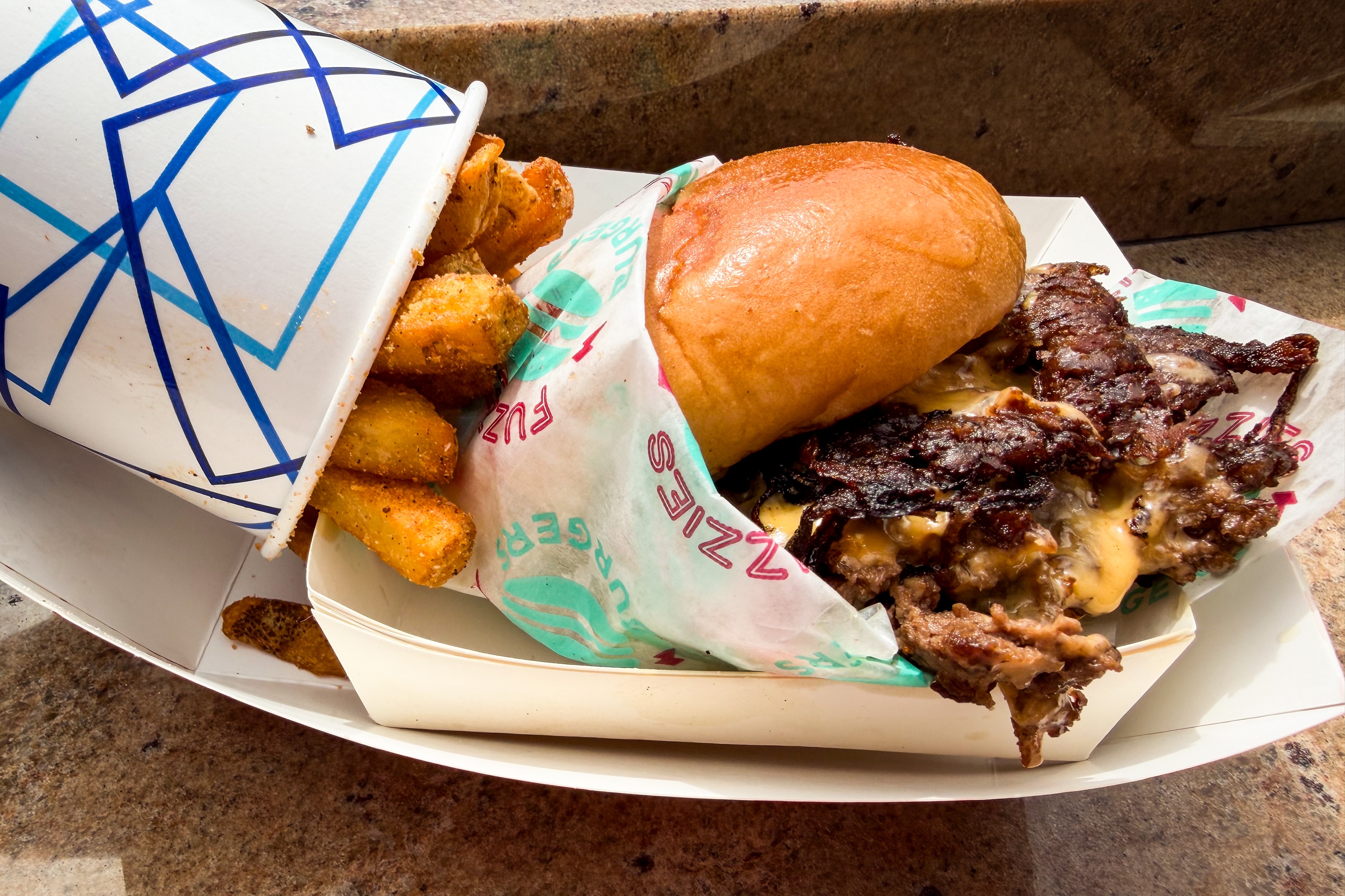 Despite the long line, the eatery had close to no opening day jitters. The signature Fuzzy ($19.99) has two patties, cheese, dill pickles and Static Sauce, a Thousand Island-like dressing. Fuzzies also has an impressive lineup of crisp, boardwalk-style fries, including shore style with malt vinegar powder and Old Bay.