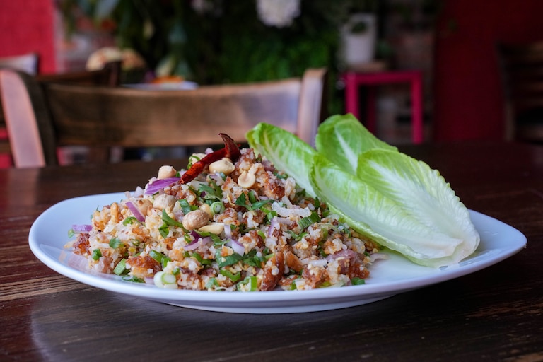 Sounakhen and her spouse, Veopheth Vongkhamta, opened Thai-Lao Garden in early April, naming the restaurant after a Parkview neighborhood garden where they grow chiles and herbs for the homestyle Southeast Asian dishes. The menu is large, spanning a variety of curries, noodles and rice: from pad thai and drunken noodles to larb gai, a minced chicken salad with toasted rice powder, and nam khao, a crispy fried rice with cured sausage and lime. Sounakhen loves the Lao sausage, stuffed with lemongrass, onions and kaffir lime leaves, which is prepared by several members of Vongkhamta’s family who work in the kitchen.