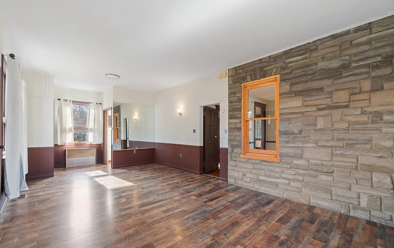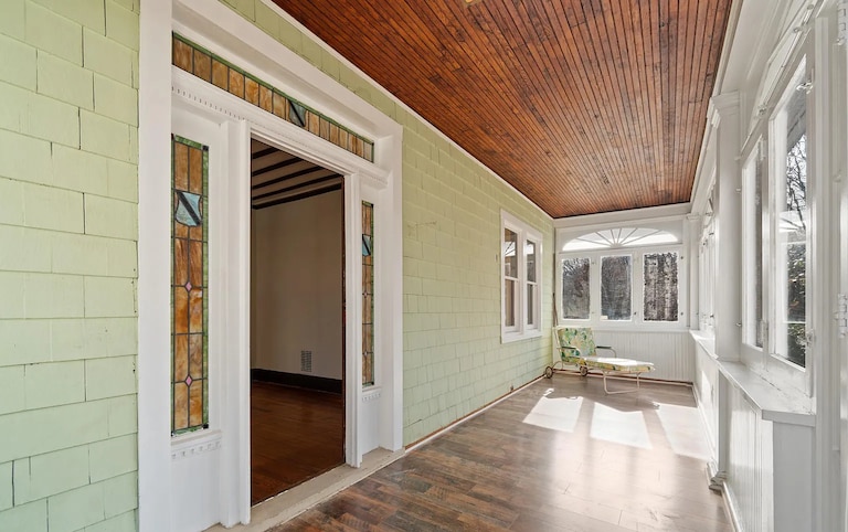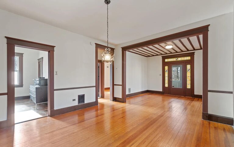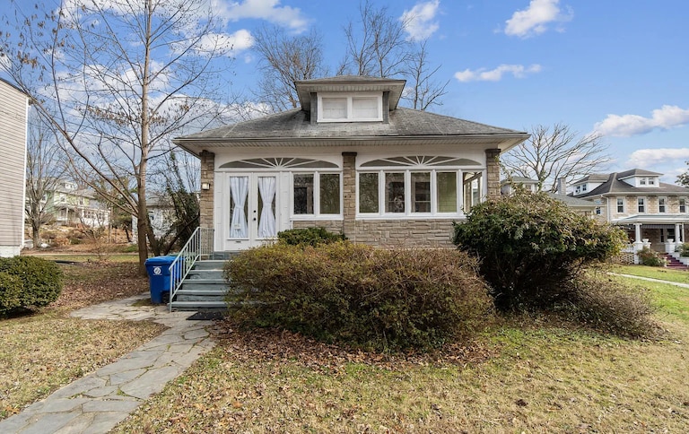 This unique home, built in 1924, is full of original details and ready to make your own. A sun-drenched enclosed porch and beautiful stained glass provide a welcoming entrance. The main living space of the home features an open living and dining room, with exposed beams, original hardwood floors, and a built-in corner cabinet. A small kitchen sits off the dining room. One bedroom sits at the front of the house, while the back of the house features a half bathroom plus a room that could be used as a second bedroom or family room. A large attic could be finished to add an additional living space. The home overlooks Herring Run Park and is around the corner from Harford Road shops and restaurants.