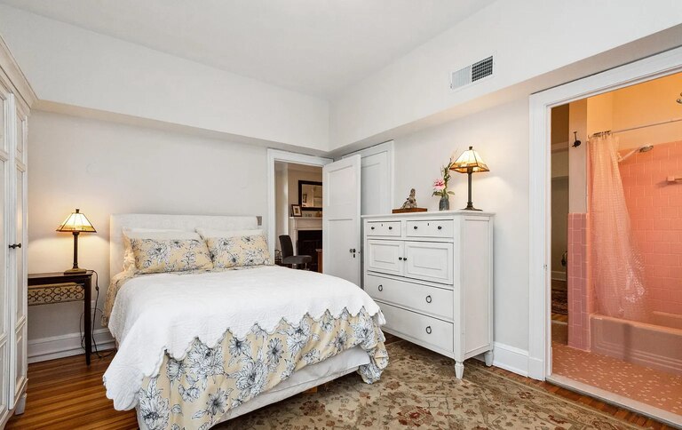 A classic co-op in Tuscany-Canterbury, built in 1918, is packed with historic charm. The unit features beautiful hardwood floors, high ceilings, and lots of natural light. The living room is the center of this home, complete with a wood burning fireplace and large windows. An updated kitchen features granite counters and stainless steel appliances, and is connected to the dining room, currently used as a library, via a serving window. Two bedrooms are located off the living room, with a retro pink Jack and Jill bathroom. The unit also includes two deeded storage areas within the building. As part of The Tuscany, you’ll have complete access to the building’s beautiful, fenced gardens. This is a co-op, meaning the monthly fee includes property taxes, heat, water, common area maintenance, and trash and snow removal.