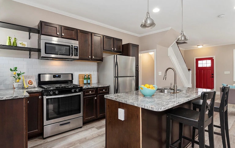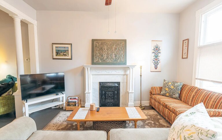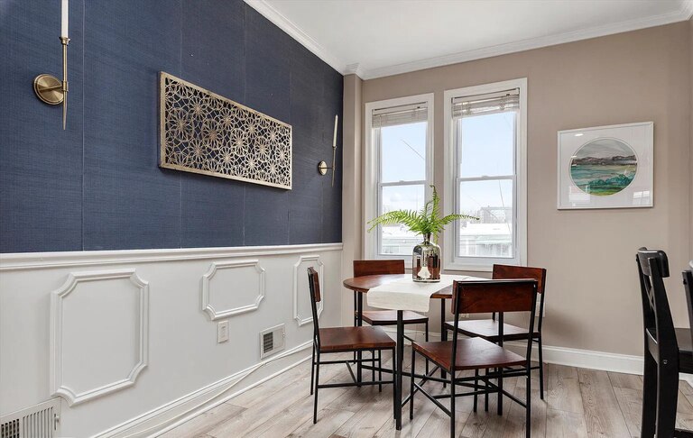 There’s lots of room in this Greektown row house filled with character and convenient updates. The living room features pocket doors and a beautiful fireplace. Separated by charming columns is a large dining room, which also opens to the kitchen, with a breakfast counter and new appliances. Upstairs, the primary bedroom is bright and spacious. A large walk-in closet off the primary bedroom could also be used as another bedroom, accessible from the hall. Another bedroom and a full bathroom are also on the second level. The basement is finished and features a second bathroom. Outside, the backyard could be used as a patio or a parking pad. The location provides easy access to restaurants and attractions in Greektown, Highlandtown, Brewers Hill, and Canton.