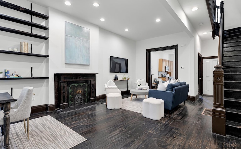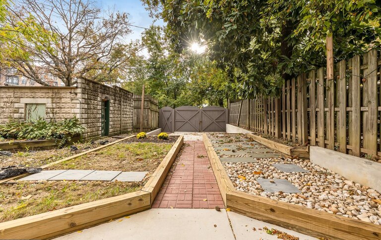 Facing Mount Royal Terrace Park, this Reservoir Hill home welcomes you with a curved front porch. Inside of the home, you’ll find a unique mix of historic and modern details. Its open concept living and dining room features dark wood floors, large windows and a beautiful fireplace. Original pocket doors lead to an updated eat-in kitchen, and there’s also a powder bathroom on the first floor. Upstairs, you’ll find four bedrooms and two full bathrooms, including a primary bedroom with a bay window and a large walk-in closet.