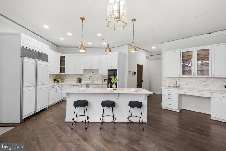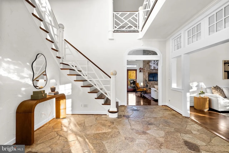 The home opens to a two-story foyer, drenched in natural light. It has unique stone floors and a charming Chippendale staircase. To the right, you’ll find an attractive living room and then a formal dining room with distinctive millwork, both of which feature rich hardwood floors. The kitchen is large, with a center island, breakfast nook and a spacious pantry.