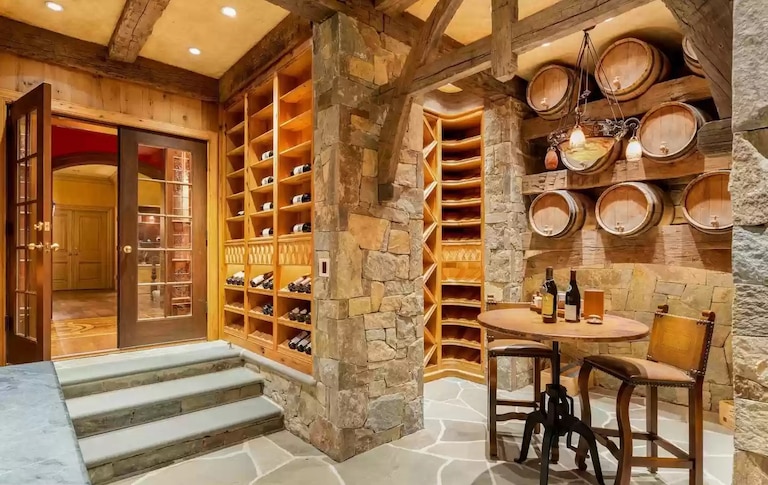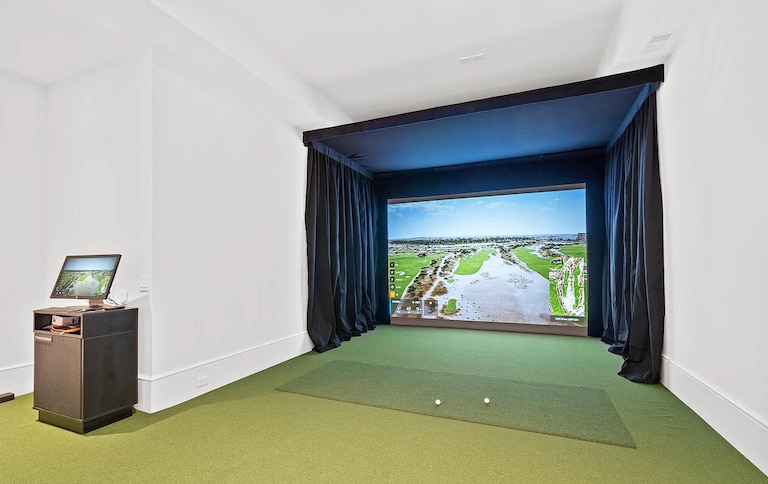 The large, modern kitchen features industrial Wolf appliances, with a 200-bottle temperature-controlled wine storage room and walk-in pantry around the corner. The primary suite features dual walk-in closets and a large bathroom with a soaking tub. The other bedrooms all have their own bathroom and walk-in closet. A lower level contains a second kitchen space, golf simulator and a workout room, easily accessible via the home’s elevator.