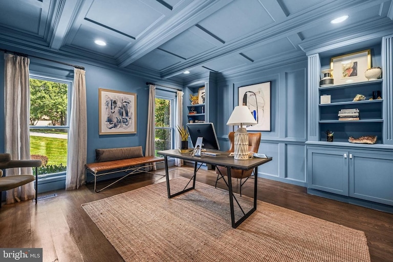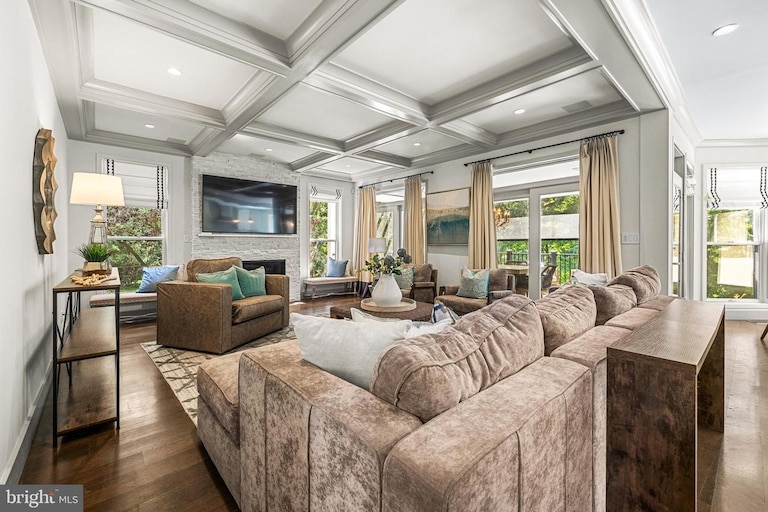 A gourmet kitchen and family room serve as the heart of the home. The kitchen is fully equipped with Viking appliances, Shaker cabinetry, and quartz counters. There are an eat-in center island, and a large breakfast nook. The family room is spacious and has coffered ceilings and a gas fireplace.