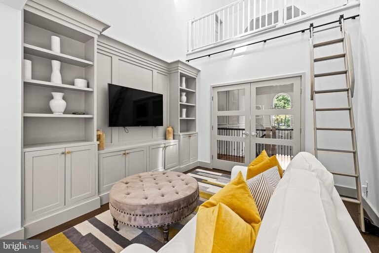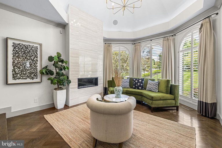 The home opens to a two-story foyer, with a dramatic staircase and porcelain floors. A bold color-drenched office with built-ins is tucked away behind modern French doors. Across the hall, a living room features a large bay window and a sleek fireplace. It opens to an inviting dining room.