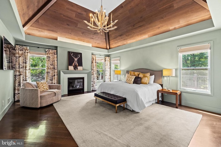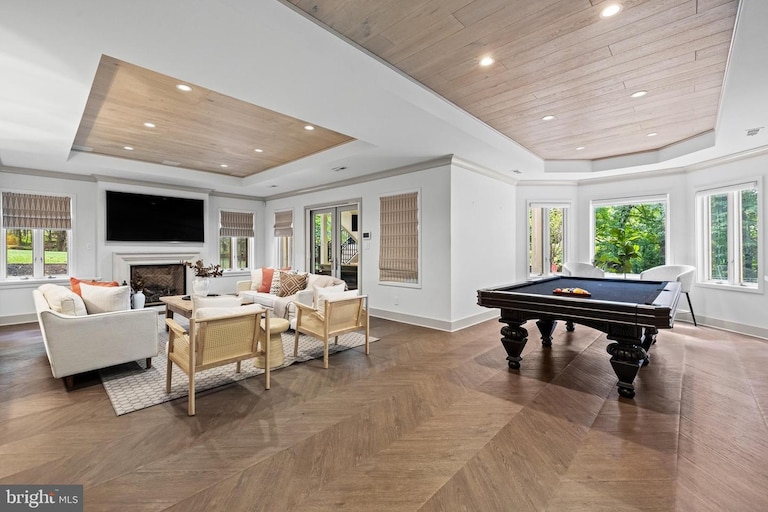 In the lower level, enjoy a large recreation room with herringbone wood floors, another fireplace and a wet bar. A fifth bedroom, an additional full bathroom, and a sleek home gym are also on this level.