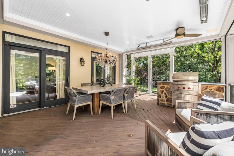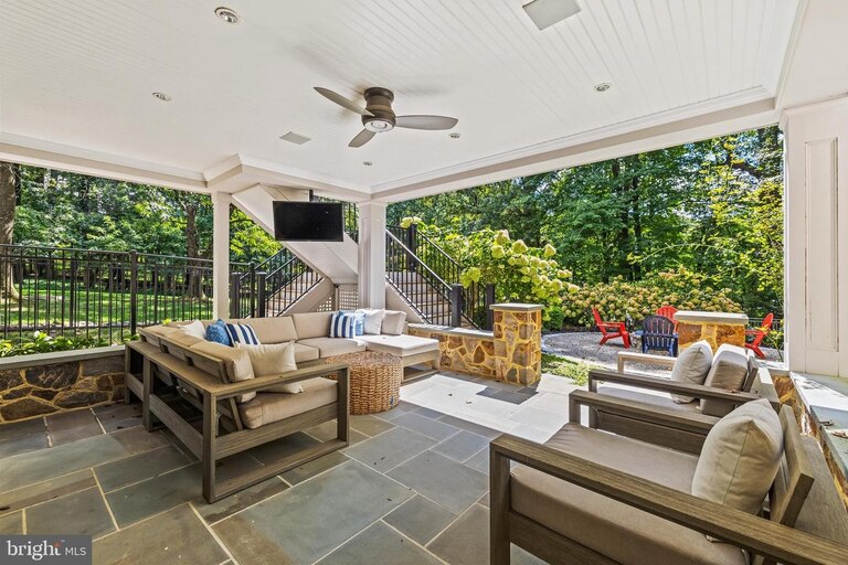 A beautiful backyard is complete with multiple entertaining areas. Off the main living space is a covered porch with a built-in gas grill, retractable screens, and ceiling-mounted heaters. Above it, you’ll find a sun deck, and below, an attractive covered patio. Another secluded patio sits off the dining room. The yard is fully fenced, and includes a dog run and a firepit. There’s also an attached three-car garage.