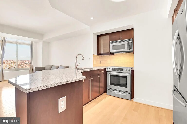 This Harbor East condo is fully updated and ready for its next owner. At just 597 square feet, this home is the smallest on the list, but is perfect for those looking to be in the heart of city life. It features an open concept living room and kitchen with wood floors, updated appliances and lots of counter space. The bedroom has floor-to-ceiling windows and a walk-in closet. The unit’s bathroom is fully updated.