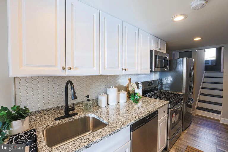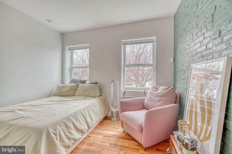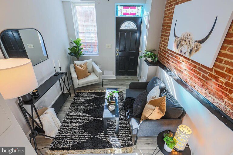 This Upper Fells Point rowhouse offers modern updates and a great location. Inside, you’ll find a living room with exposed brick, stained glass above the front door, and new flooring. A small kitchen has new appliances, countertops, and a backsplash with storage space and room for a table. Upstairs, you’ll find two bedrooms and a newly updated bathroom.