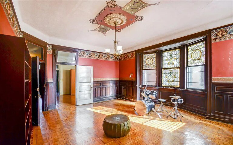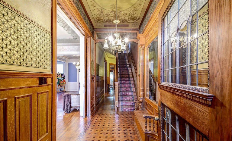 Upstairs, the second-story rooms are similarly ornate, providing three bedrooms, a sitting room, and two bathrooms. A third level, which could be converted to a separate unit (or the lower level could be, the building is licensed for two units), provides a similar layout to the second story, with three additional bedrooms.
