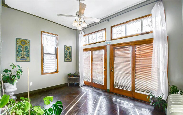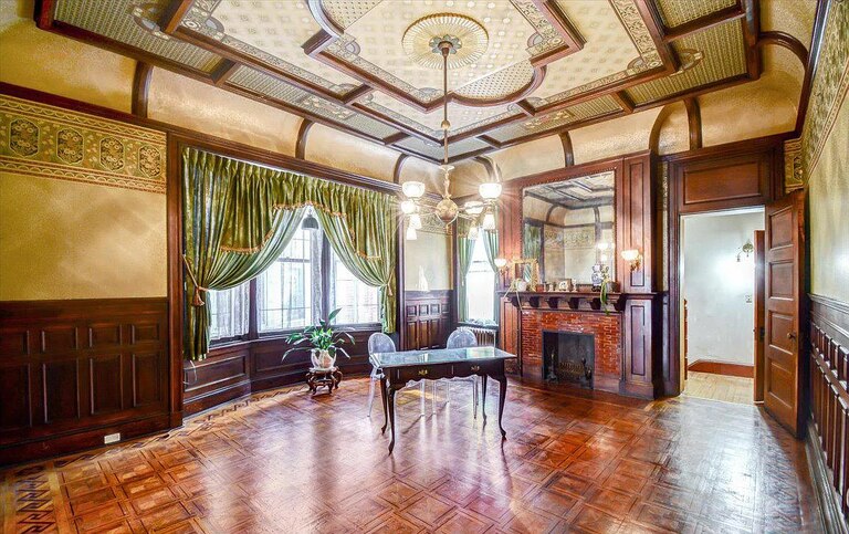Pass through a smaller, but still ornate room, to reach perhaps the most stunning room in the house, the dining room. This room features beautiful parquet wood floors, a charming fireplace, and a masterful, ornate ceiling that is layers of silk-screened designs and custom-carved plaster and wood moldings. There’s also a large kitchen, with attached sunroom on this level.
