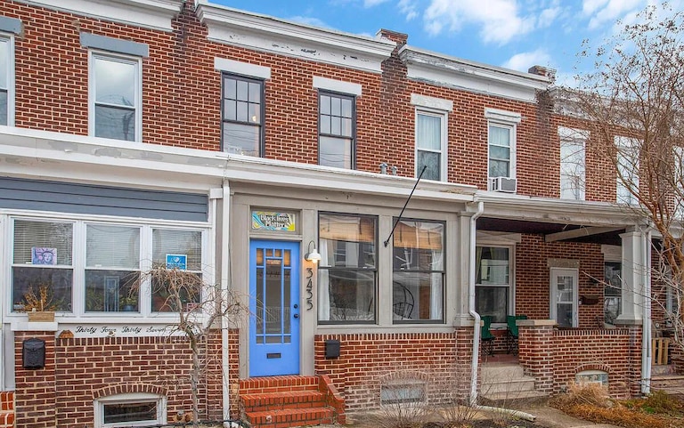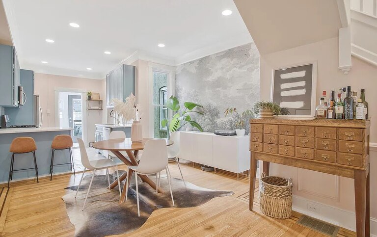 This bright and updated rowhome is just a block away from Patterson Park. The home features exposed brick, hardwood floors and unique stained-glass windows. An open concept main level contains a shared living room, dining room and a large kitchen. Upstairs, a large skylight and new flooring create bright and welcoming spaces. There are two bedrooms, including a primary room with a walk-in closet and a full bath. A finished basement offers space for a family room or playroom, and a back room is used for laundry and storage. A parking pad is available in the back of the house.