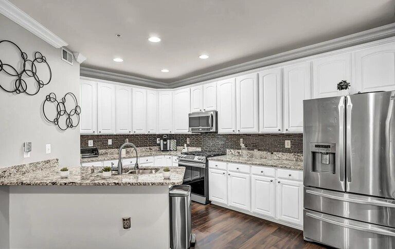 This three-story townhome, located within the Emerson Community in Laurel, is updated and ready for its next owner. The first floor of this home, built in 2004, has a spacious bonus room, full bath, and laundry room. The main floor features a bright and spacious living room. An updated kitchen with granite countertops, stainless steel appliances, and a breakfast bar is also on this level, and opens to a dining area and family room with a gas fireplace. On the third level, a large primary bedroom features a walk-in closet, a sitting area and an en suite bathroom with soaking tub and separate shower. There are two other bedrooms and another full bathroom on this level.