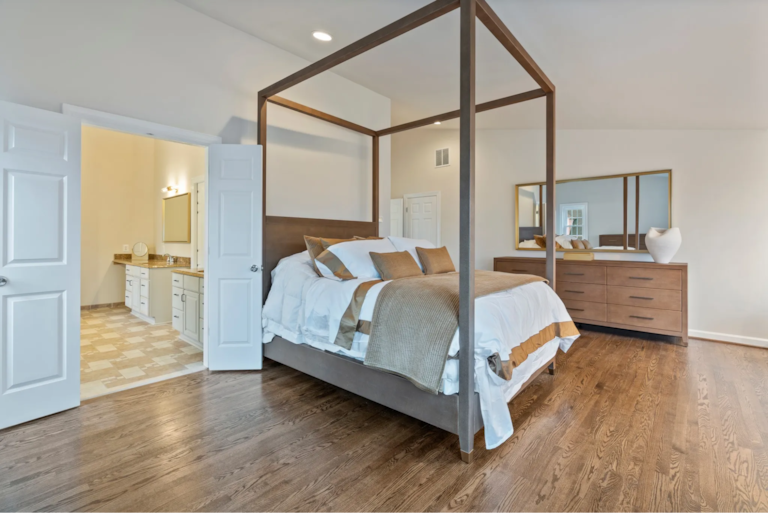 The home has six bedrooms and four and a half bathrooms, across three levels of living space. The generously sized primary suite is upstairs, with a walk-in closet and spa-like bathroom.