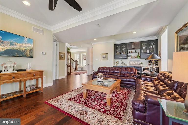 Three additional bedrooms, each with their own ensuite bathroom, are on the home’s third story. A second primary has a private porch and a luxurious bathroom. A large landing with a wet bar provides an additional place to relax and overlooks the family room below.