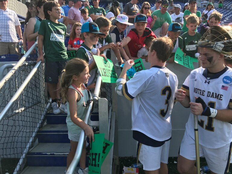 Notre Dame graduate student midfielder Jack Simmons, a Lutherville native who played at McDonogh, looked at the dozens of giddy elementary school kids gathered near the front row of Navy-Marine Corps Stadium in Annapolis, arms outstretched over the white concrete wall.