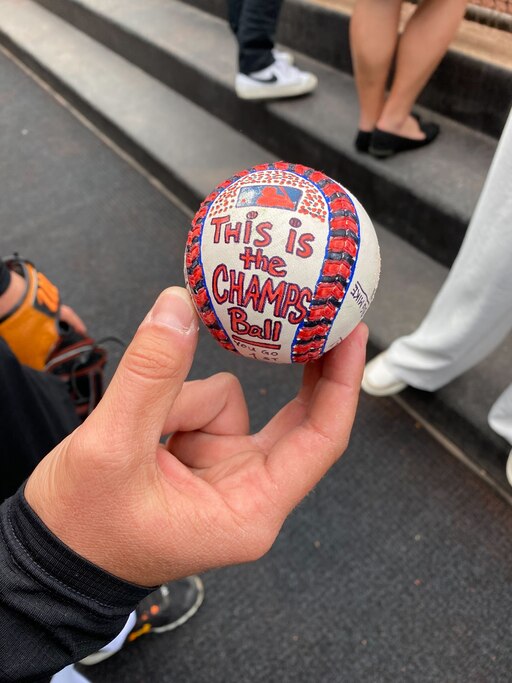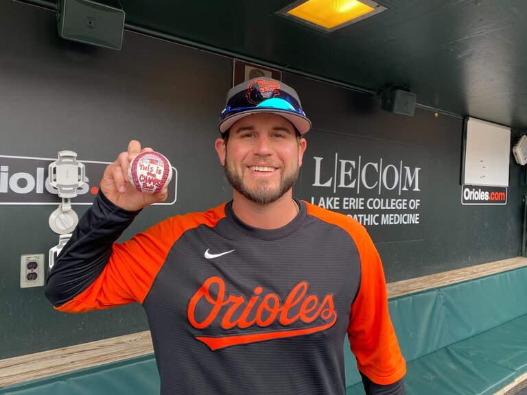 Carhart put his markers away, looking down at the colored baseball. The laces were an interchanging black and red with a blue border. The Orioles bullpen catcher had drawn the Major League Baseball logo, added blue-and-red dots around it, and then crafted in block red letters the meaning of this special baseball: “This is the CHAMPS Ball. You Go 1st,” it reads.