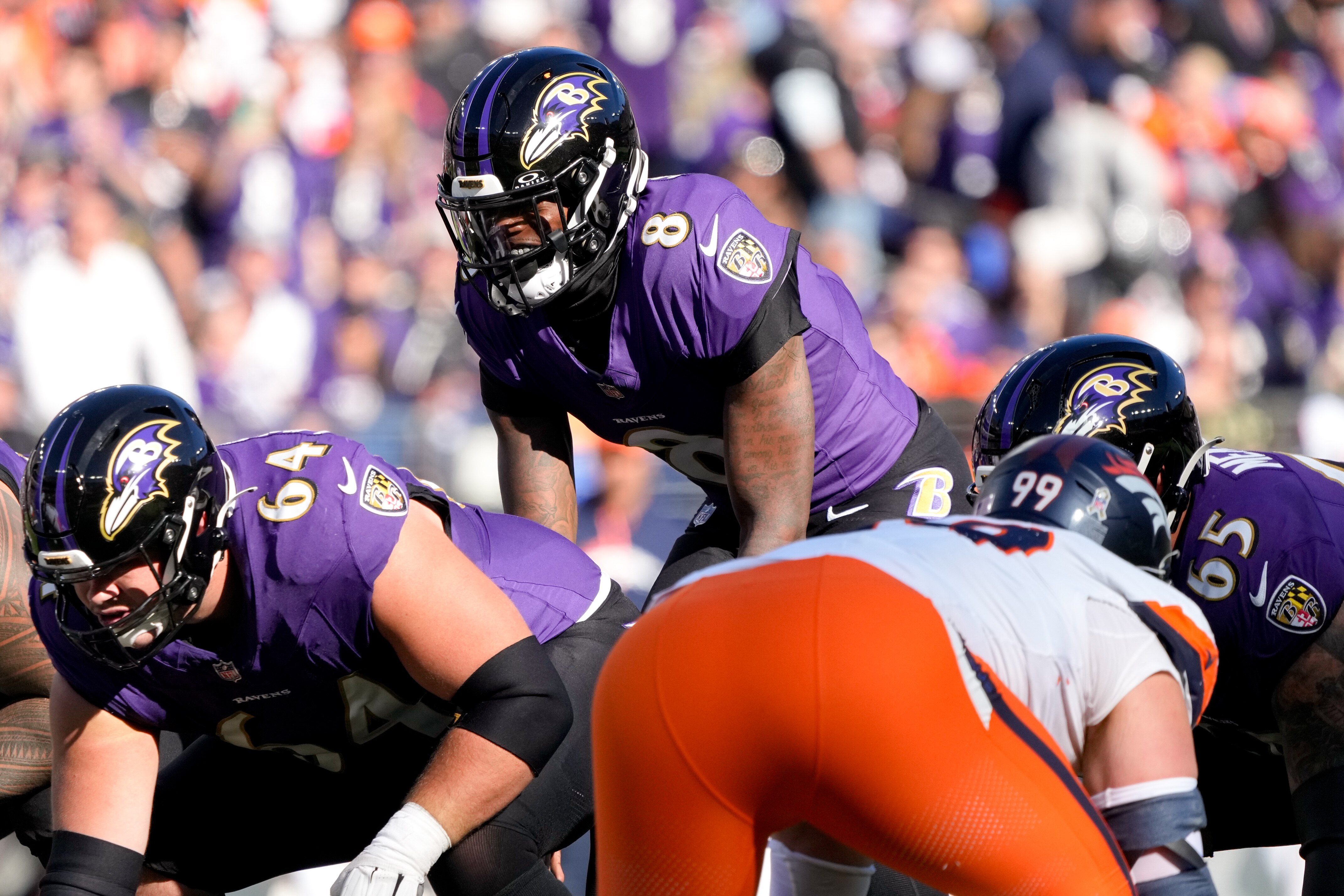 Midway through the second quarter Sunday, Ravens quarterback Lamar Jackson went looking for clues. The Denver Broncos were showing a pre-snap blitz look on second-and-5, and Jackson’s best available fact finder was nearby.
